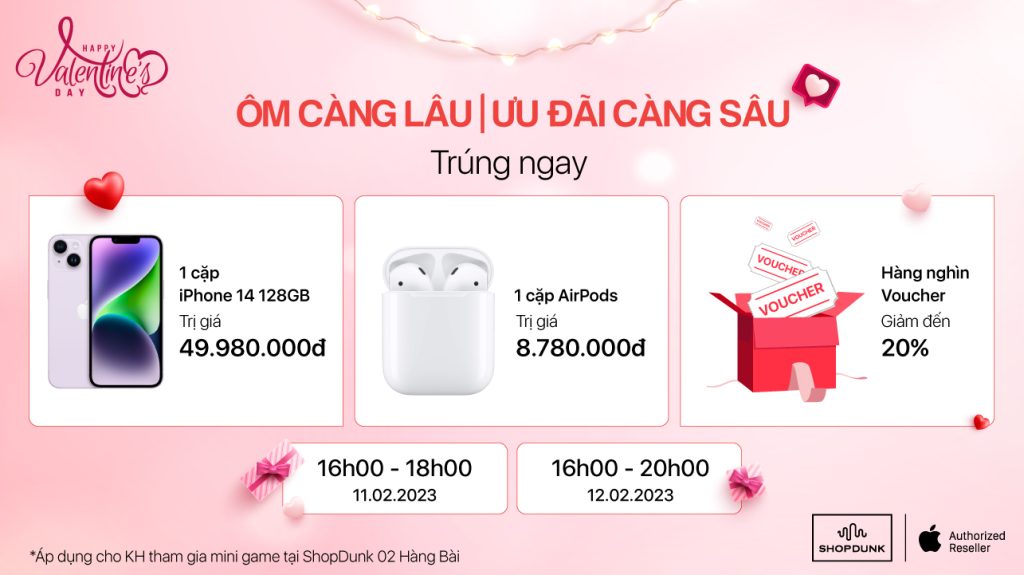 Để Lễ Tình Nhân 14.02 thêm đặc biệt và lãng mạn bên “người ấy”, lưu ngay lịch đăng ký chơi Game “Ôm càng lâu, ưu đãi càng sâu” cùng ShopDunk thôi bạn mình ơi! Ngoài ra, Ưu đãi Apple dịp Valentine lên đến 9.000.000đ đang chờ bạn tại Hệ thống cửa hàng ShopDunk toàn quốc.